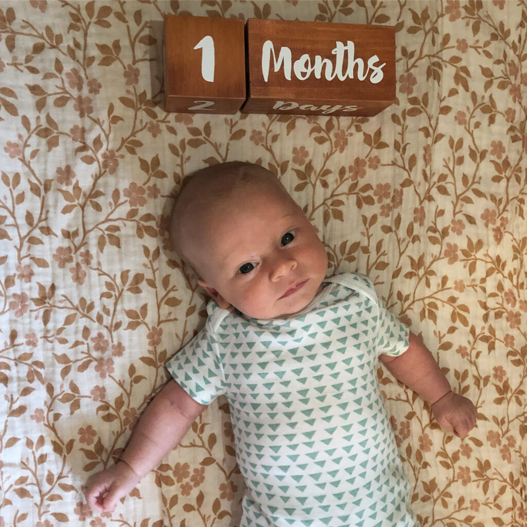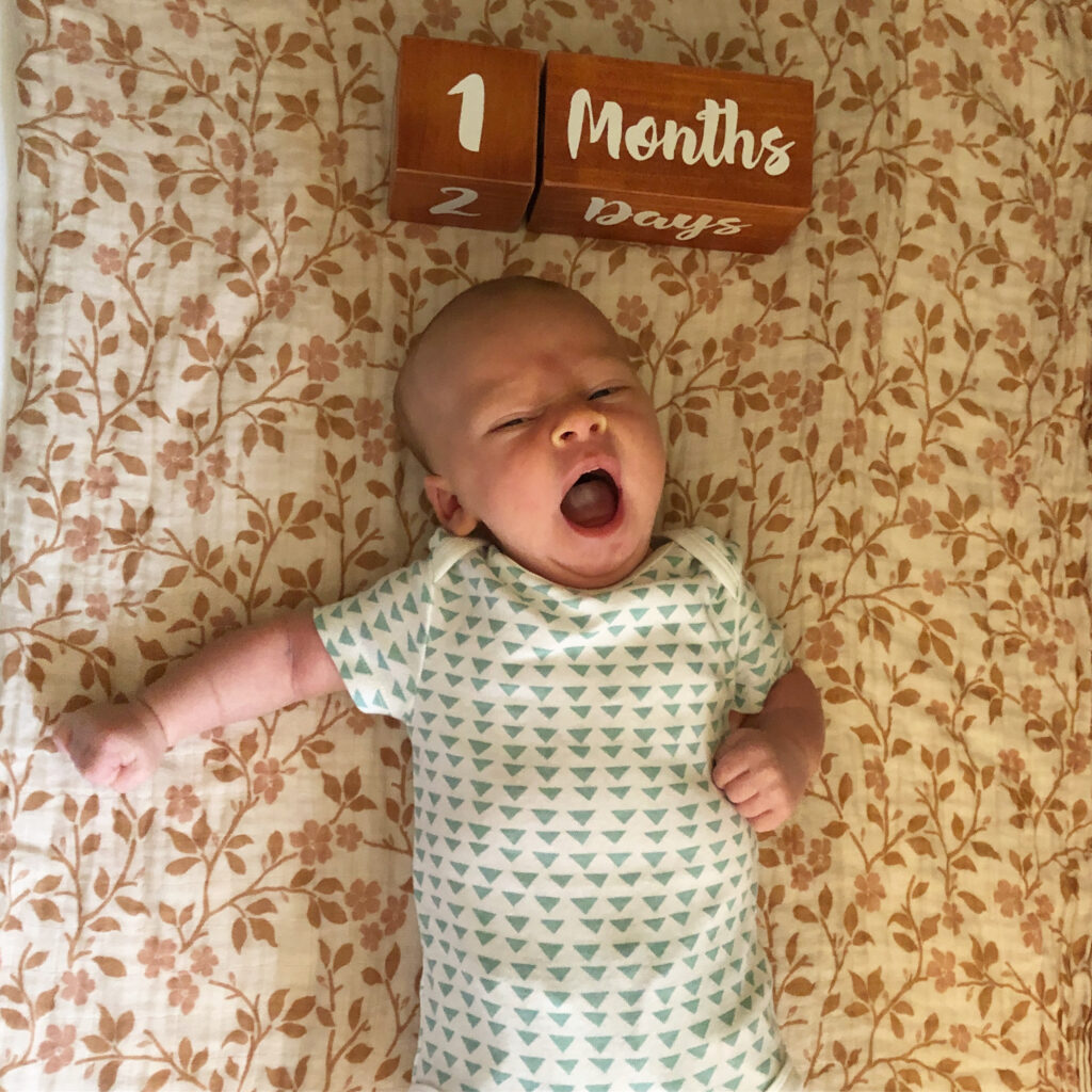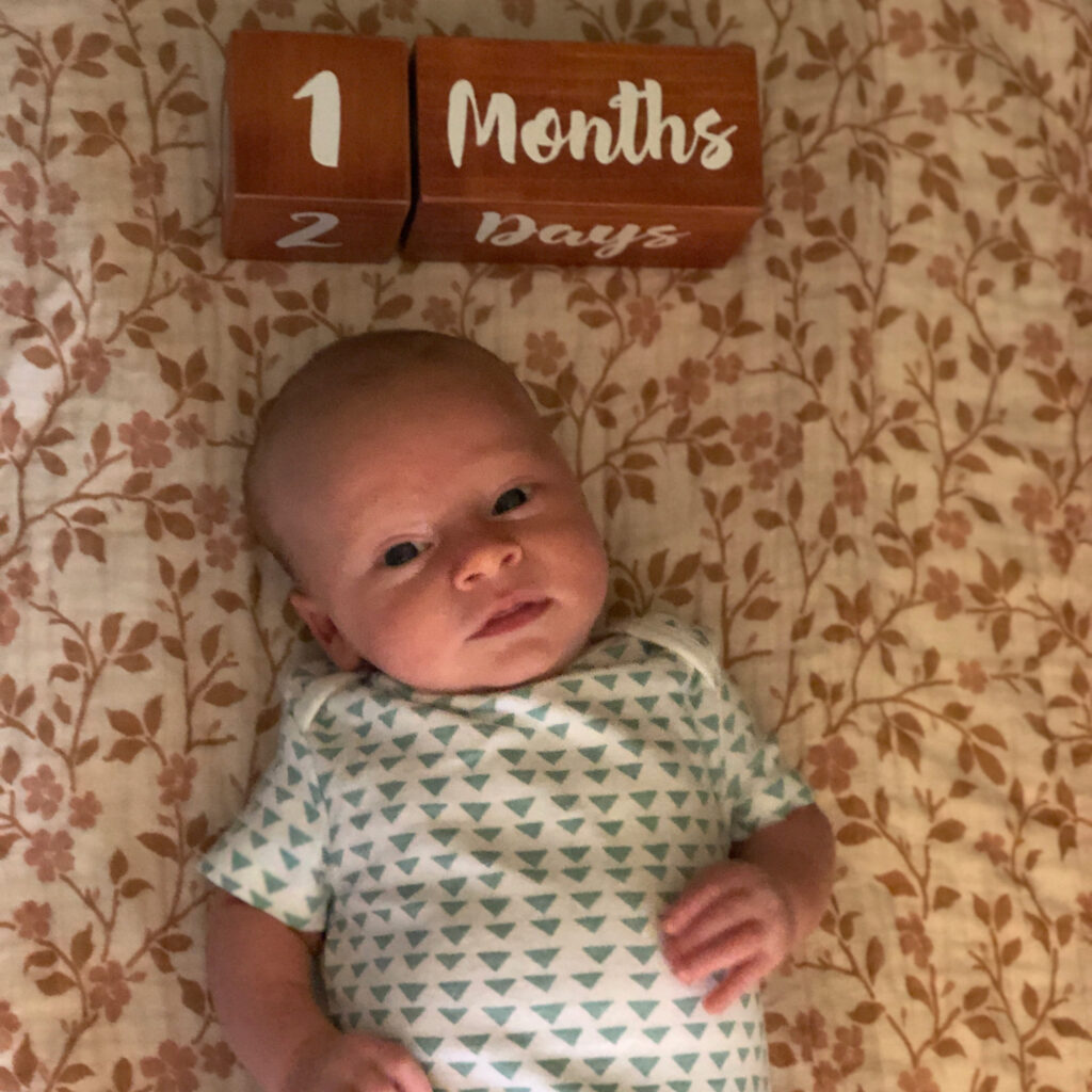 Loves:Snuggling on Mommy’s shoulderSleeping on Daddy’s chestStaring at the ceiling fanWalks in the strollerStretching his arms out while falling asleepOne month old!